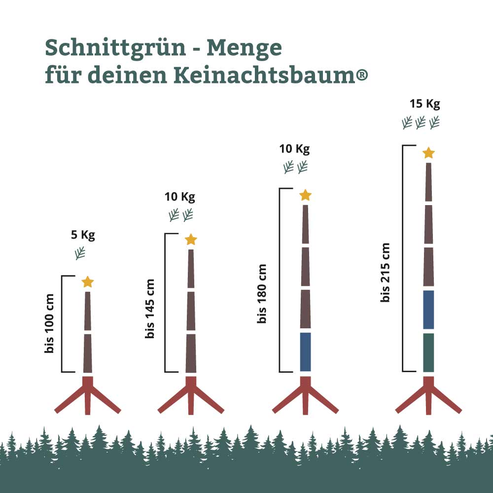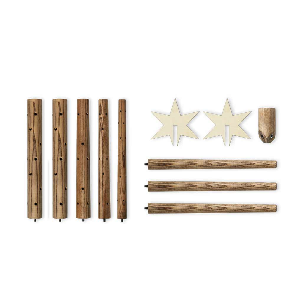 Der Keinachtsbaum-Bausatz besteht je nach gewählter Größe aus 2-5 konisch zulaufenden Holz-Elementen, einer Sternspitze und optional einem Fuß.